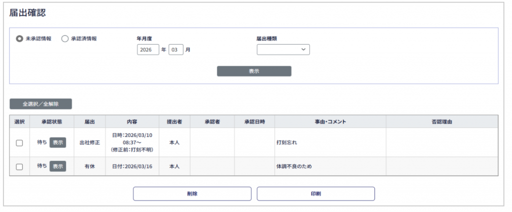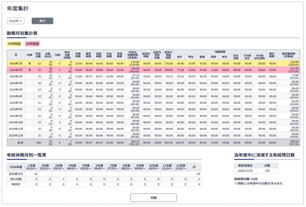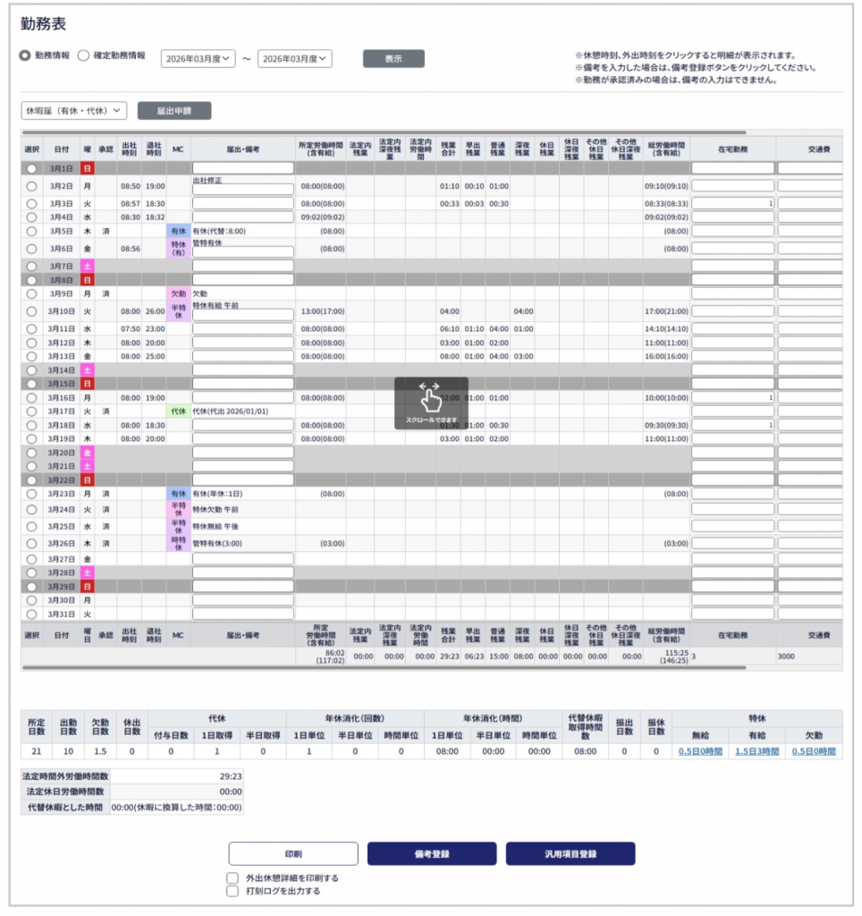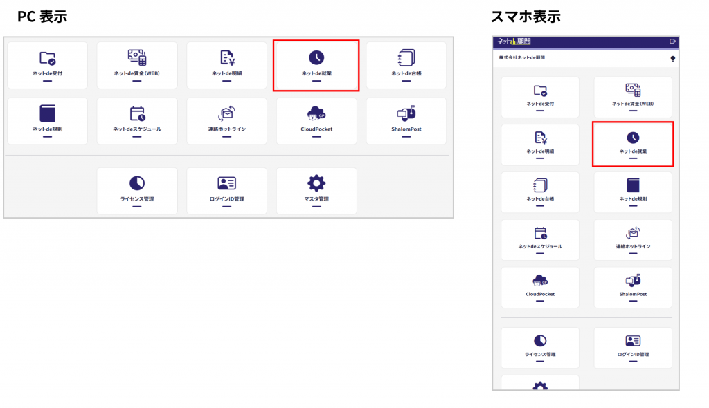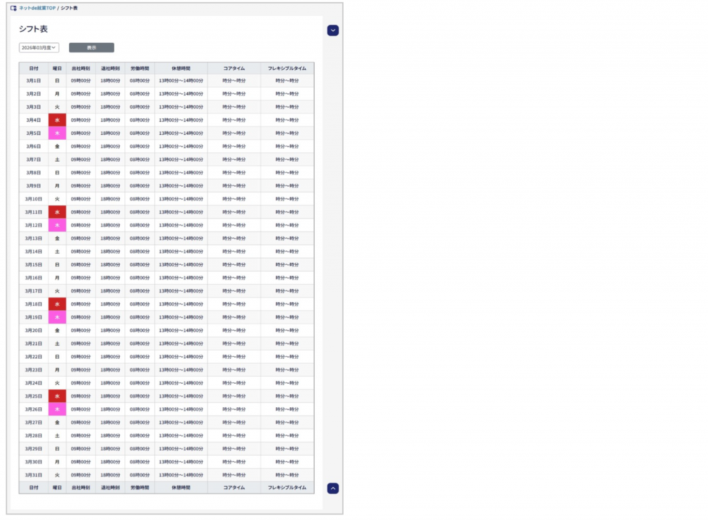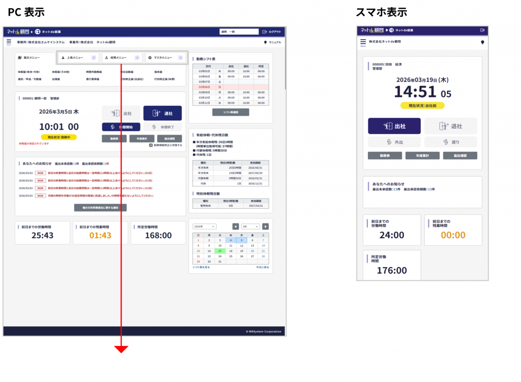 新画面デザインになるのはトップの打刻画面、各届出申請画面、届出確認、シフト表、勤務表、年度集計になります。