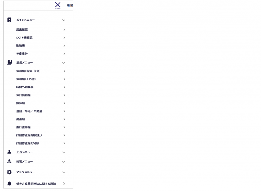 上長メニュー、総務メニュー、マスタメニューについては旧画面デザインのままとなります。