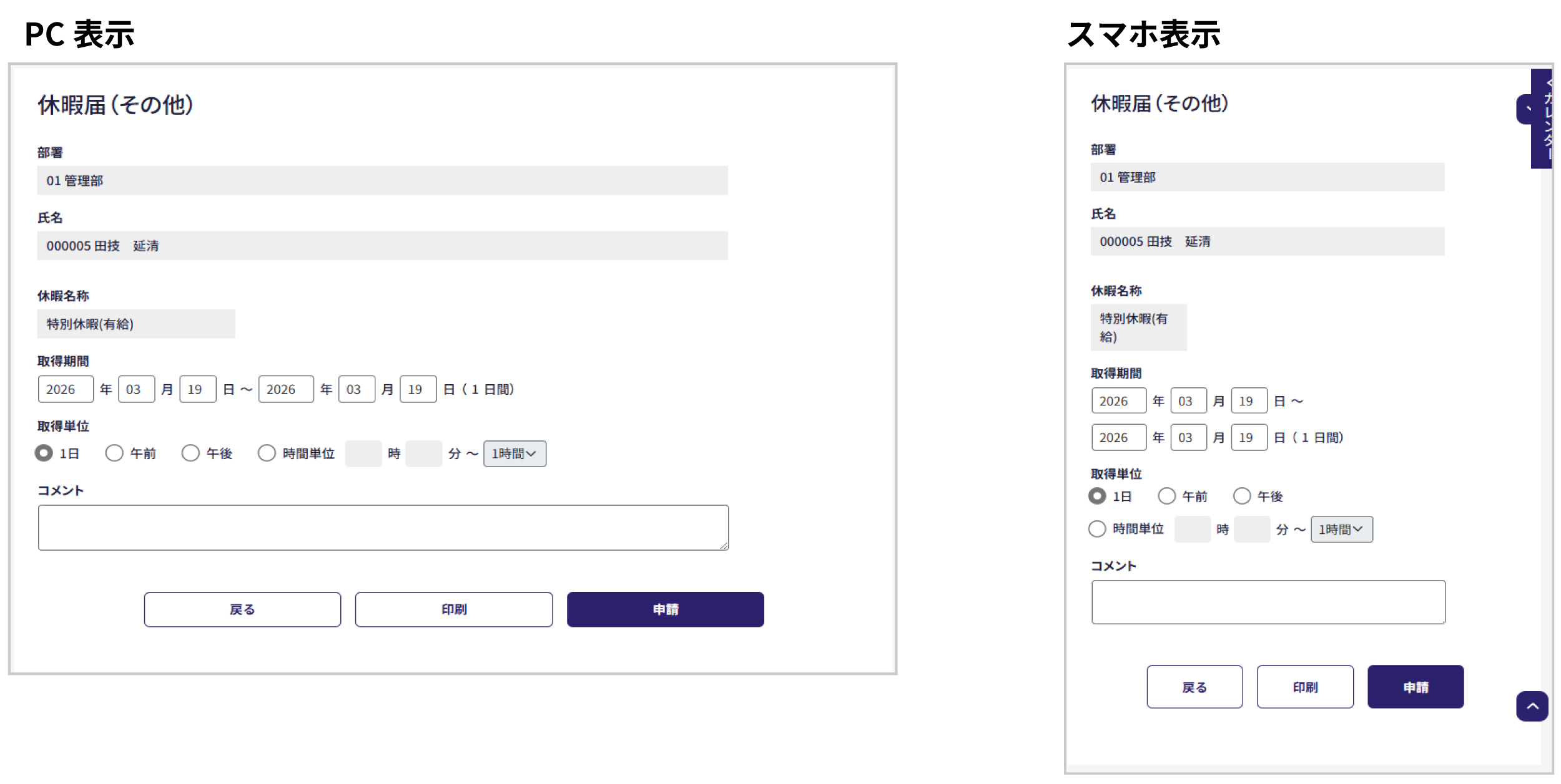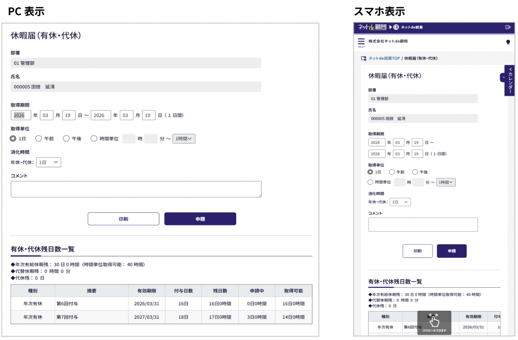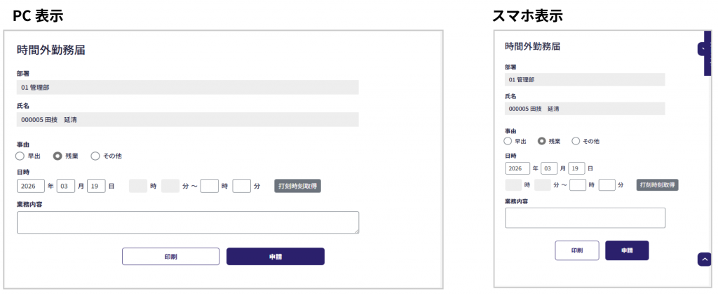 各申請画面はスマホサイズの表示に対応しますので、スマホからも申請しやすくなります。