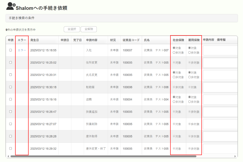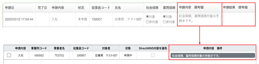 ○「Shalomへの手続き依頼」で、一覧に申請内容について備考等を記入する欄を追加します。記入した内容は、Shalomへ手続きを申請した後、Shalomの「DirectHRのデータ取込」で確認できます。