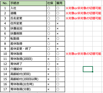 ○社会保険・雇用保険のラジオボタン表示(○:対象、×:非対象)