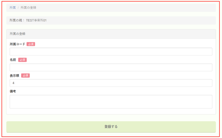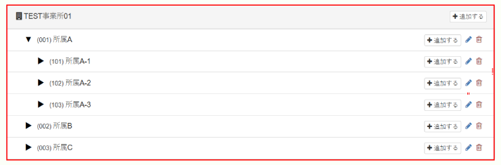 所属の追加・編集・削除ができます。①は親となる所属を、②は①の配下となる所属を登録します。