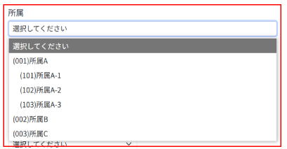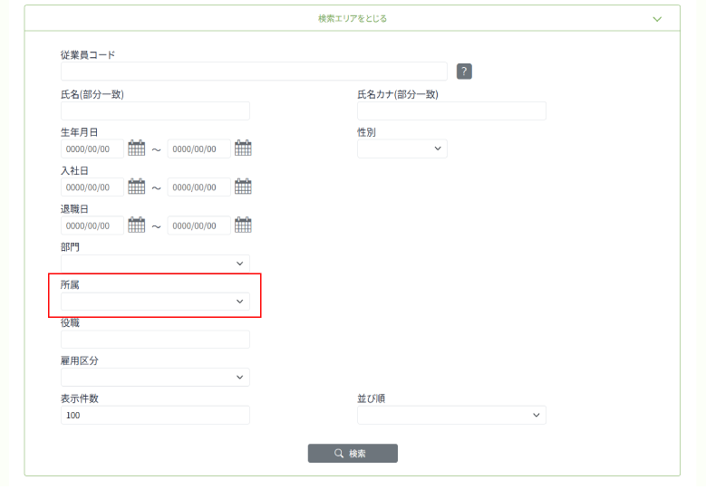 7)従業員の一覧画面で検索条件に「所属」を追加。