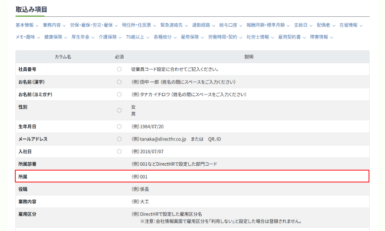○Shalomの「DirectHRへの従業員情報の送信」で、DirectHRに送信する項目を追加します。