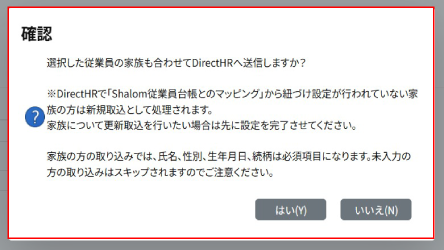 ShalomからDirectHRへ従業員を送信する際に、家族も送信するか確認されます。「はい」を押下すると家族も送信されます。