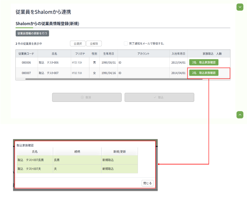 「〇名 取込家族確認」のボタンを押下するとダイアログが表示され、家族情報を確認することができます。更新取込の場合も同様です。