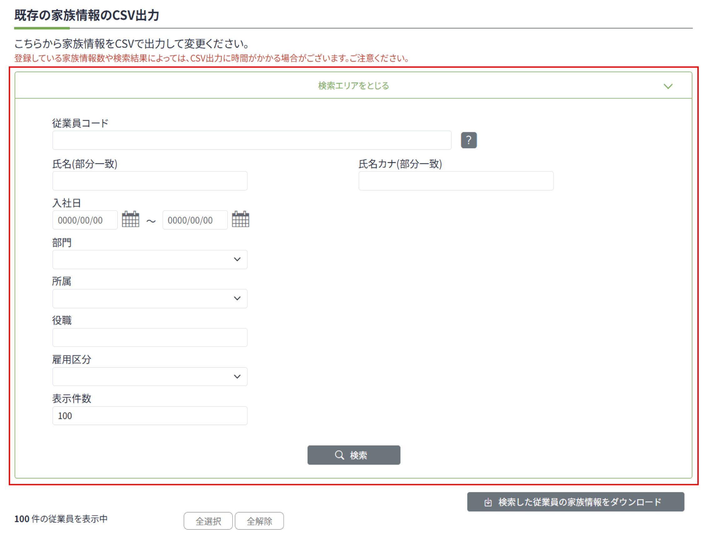 ○従業員情報の更新(CSV取込)のCSV出力は、社員番号の範囲検索で絞り込むことができます。また、家族情報の更新(CSV取込)のCSV出力は、すべての家族情報が出力されています。