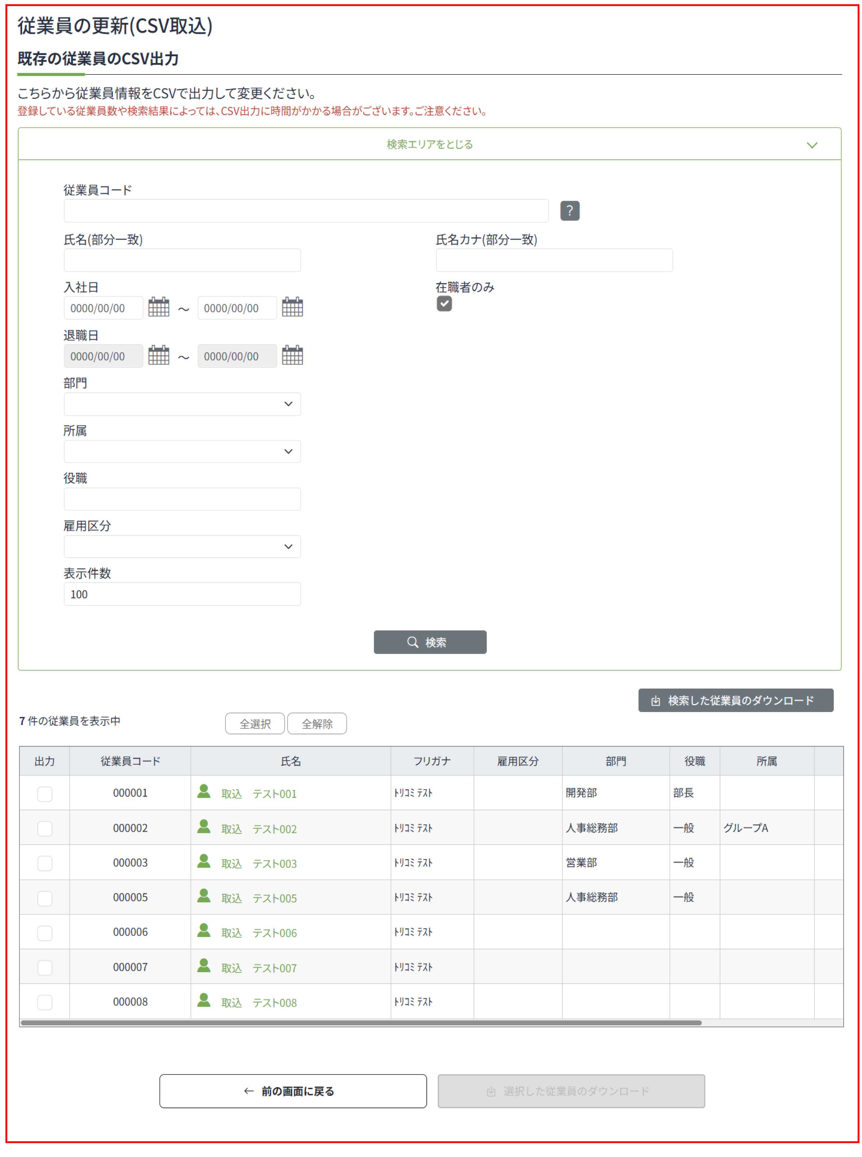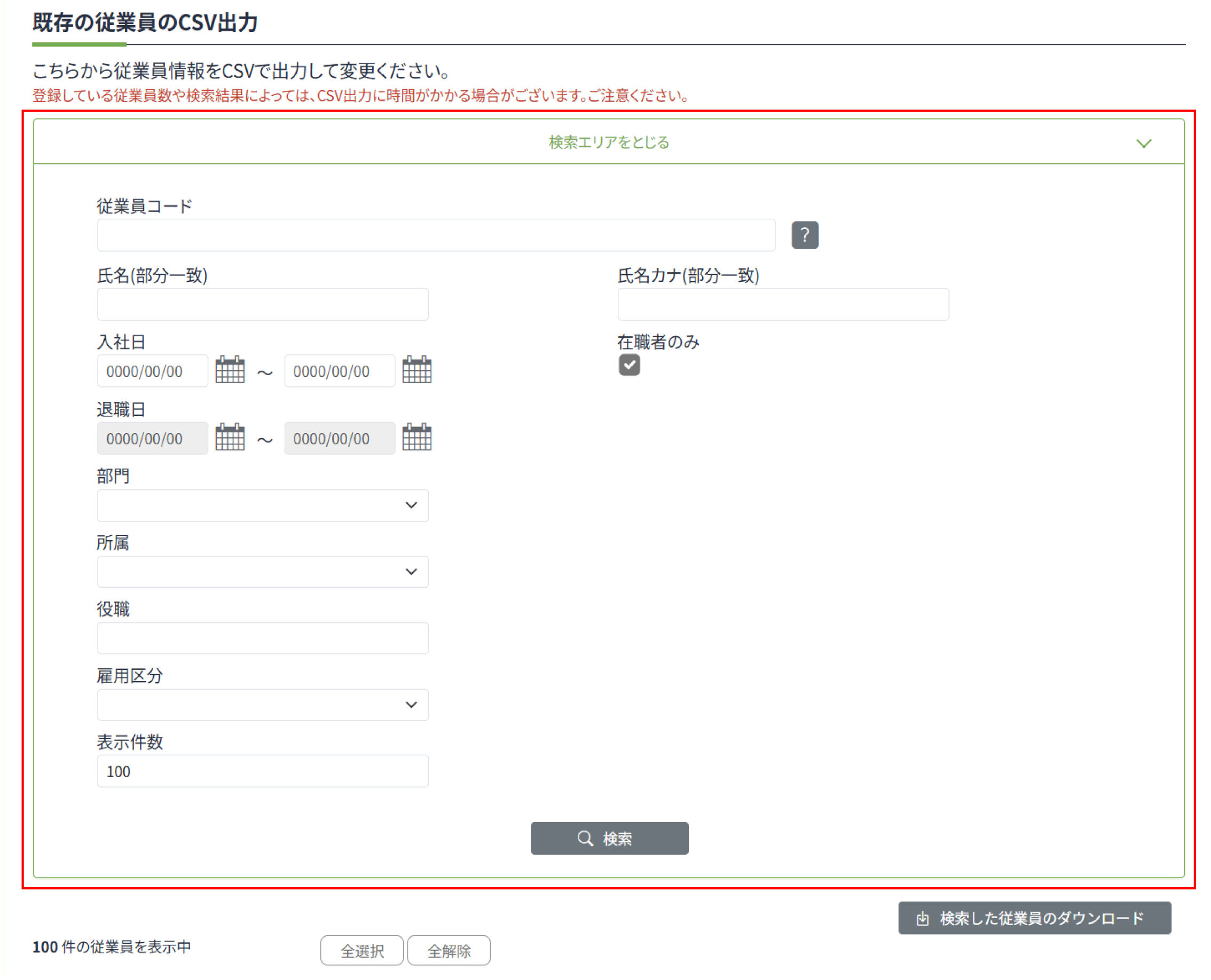 ①検索で絞り込んだ従業員をダウンロードしたい場合は、「検索した従業員のダウンロード」ボタンを押下します。