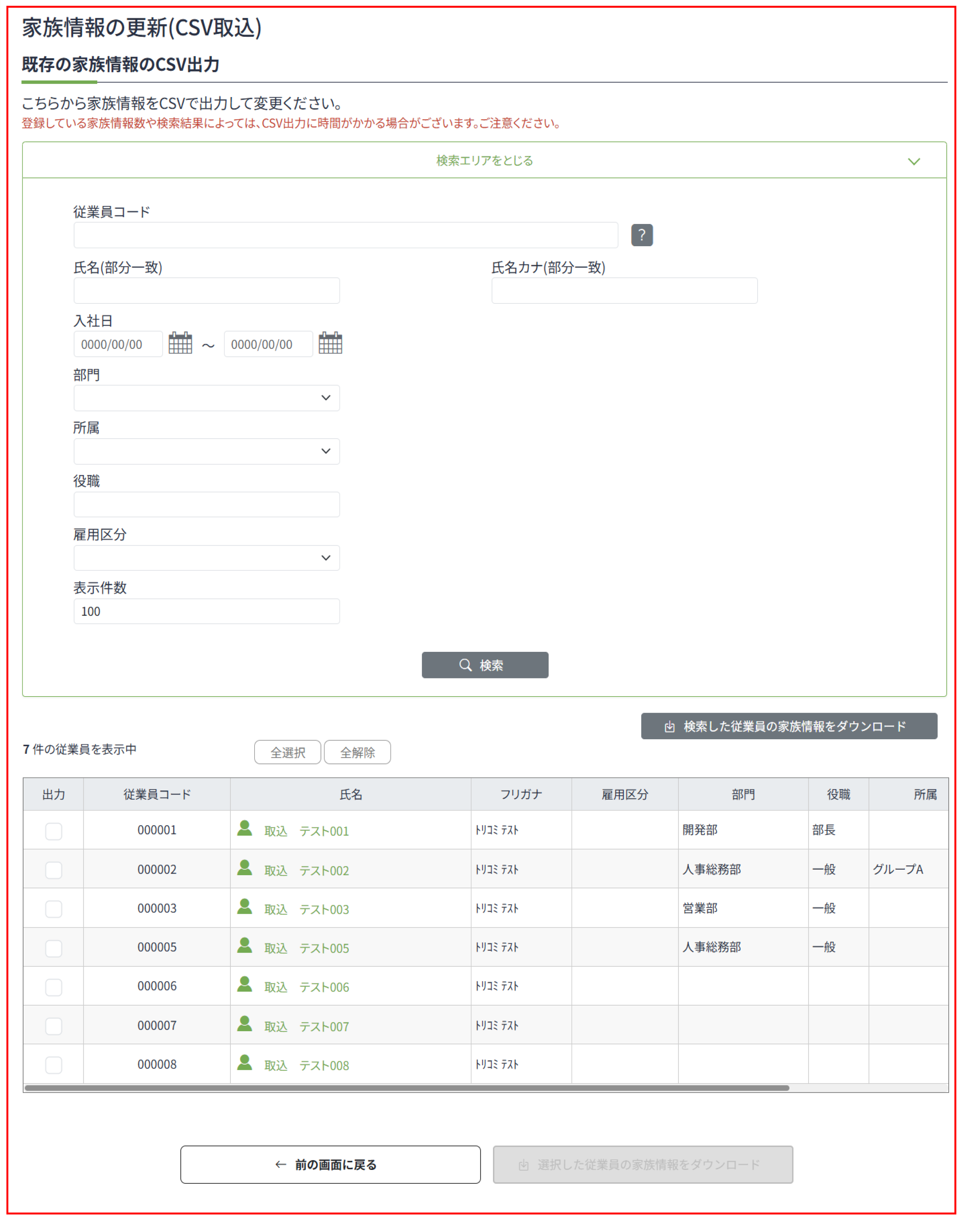 従業員・家族ともに検索機能を実装し、該当する従業員やその家族のみ出力できるようにします。