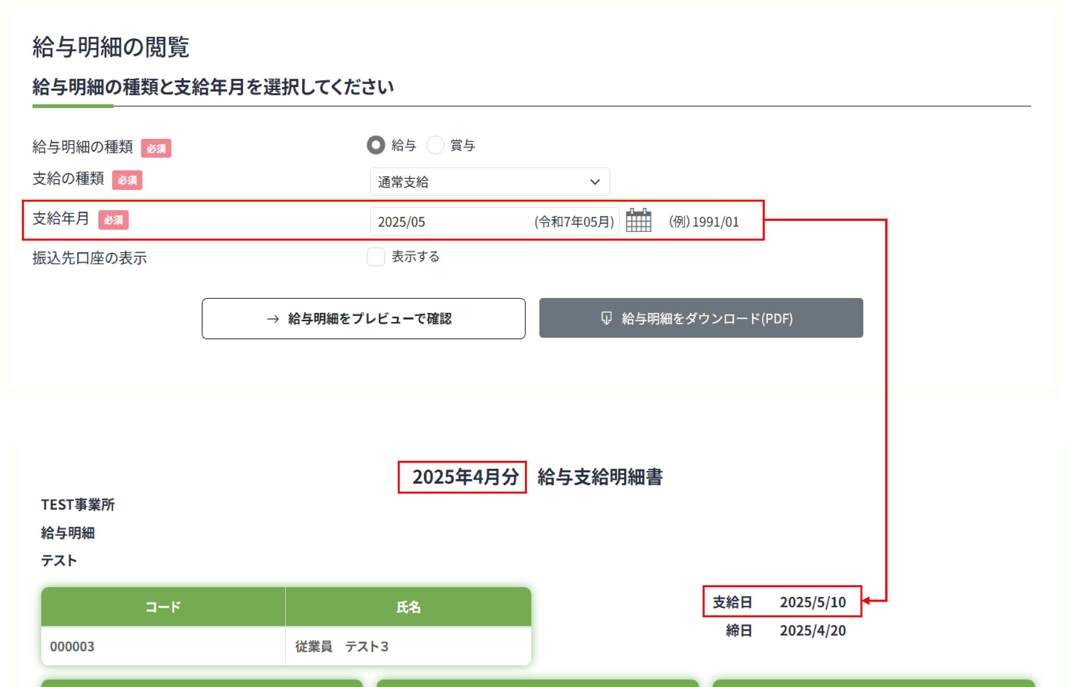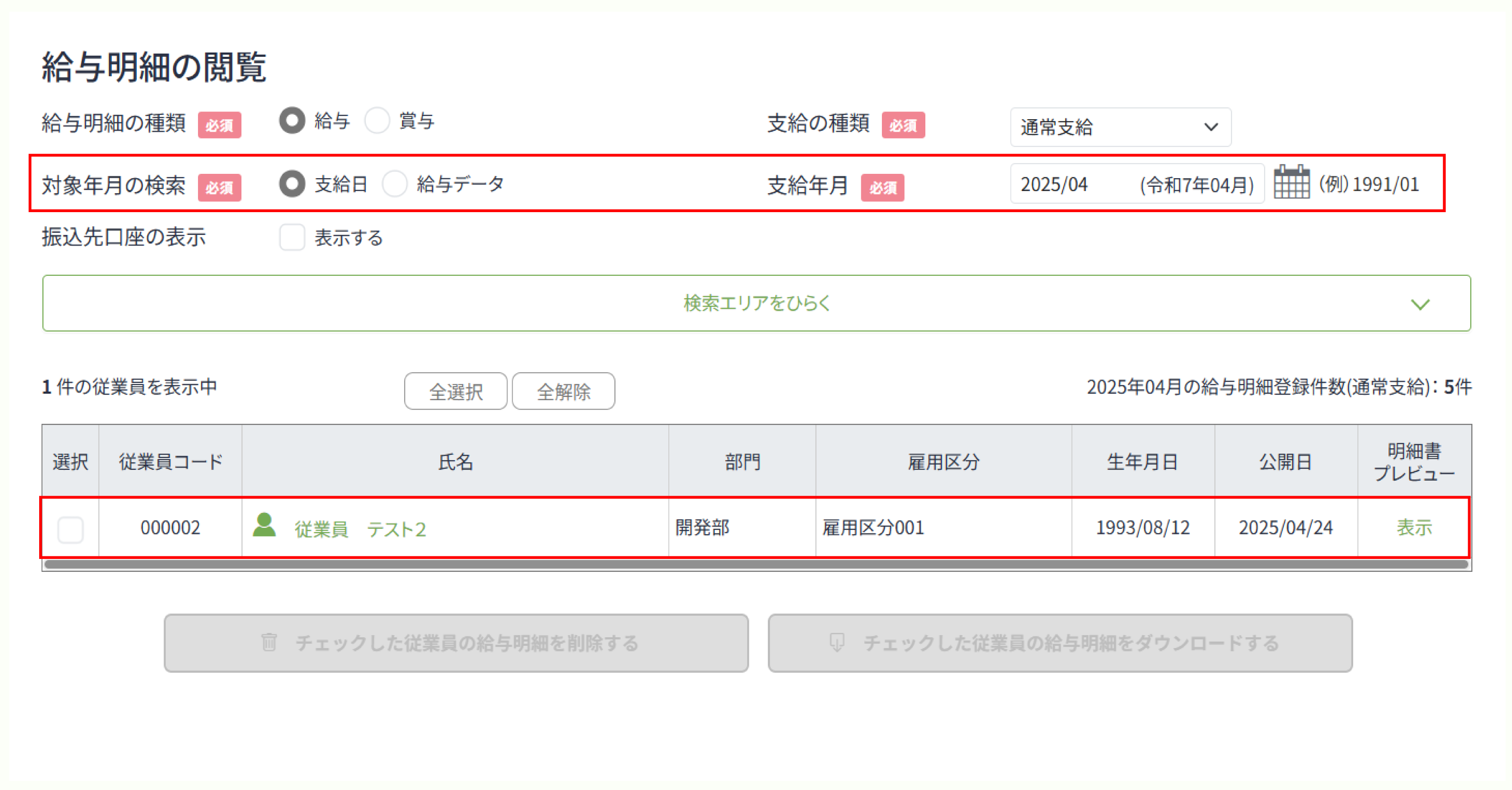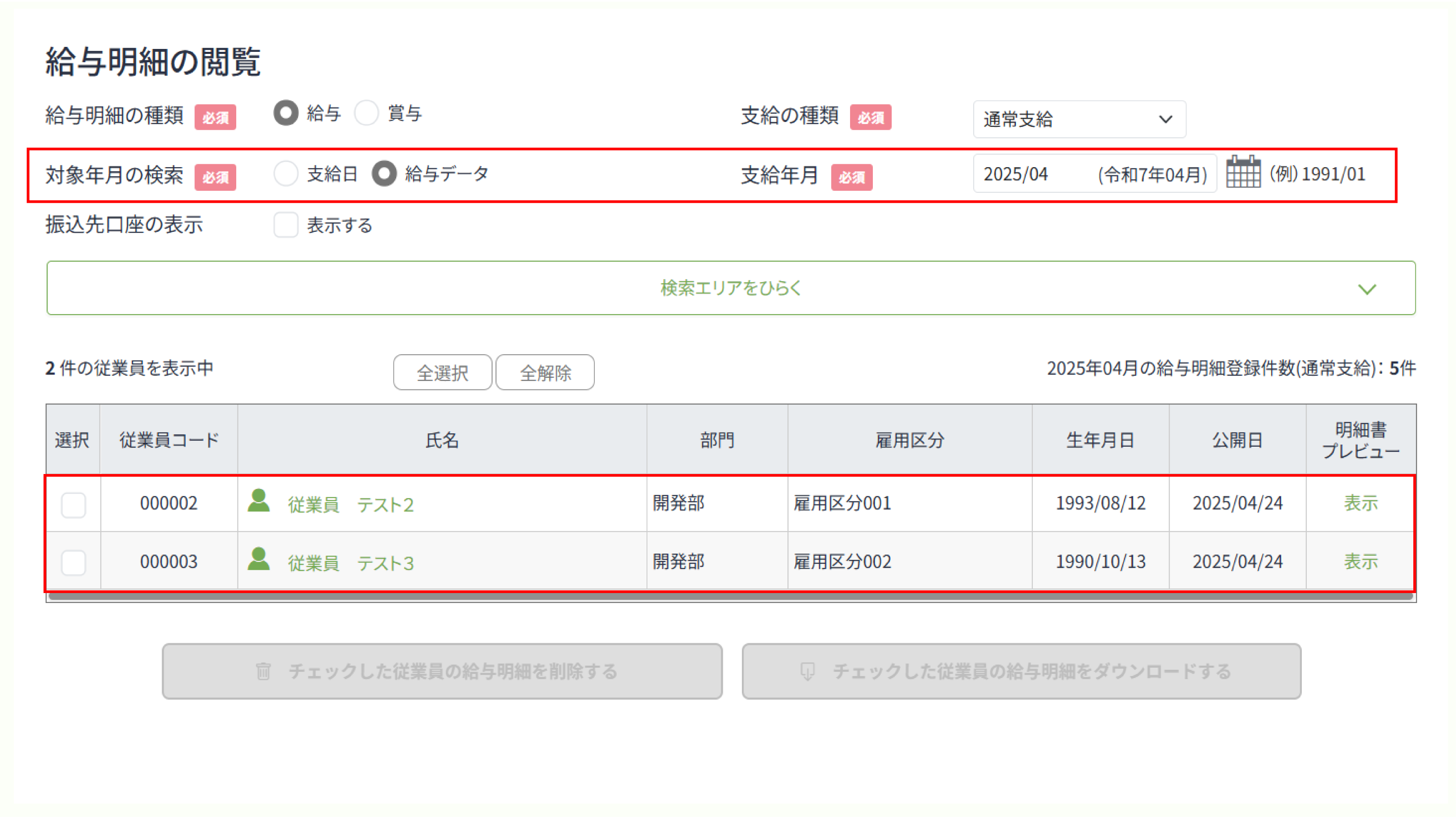明細データの「支給日」を2025年4月で登録した従業員が表示されます。