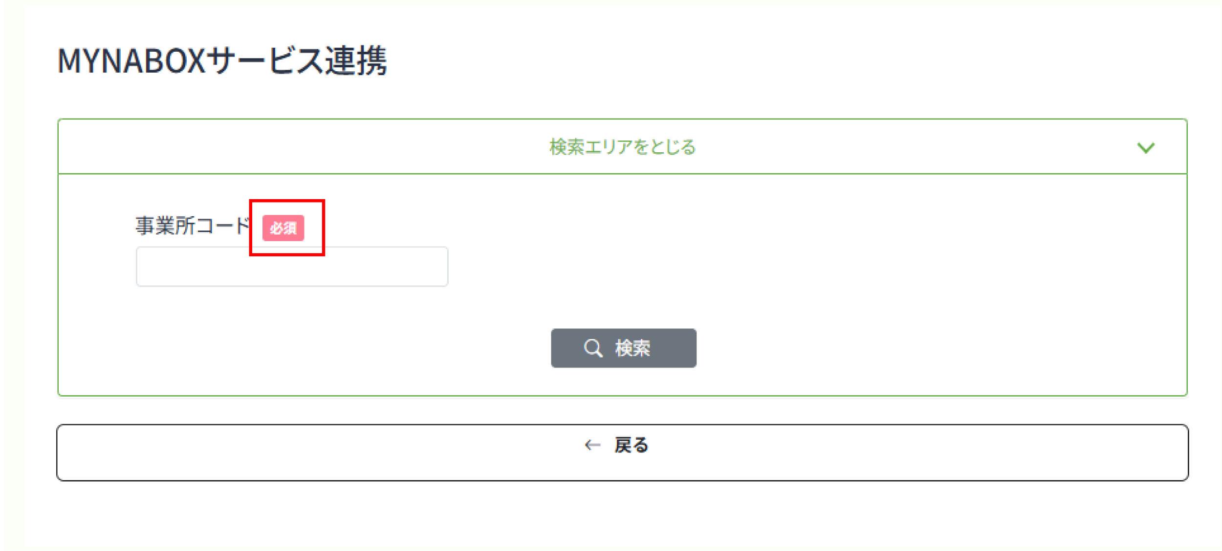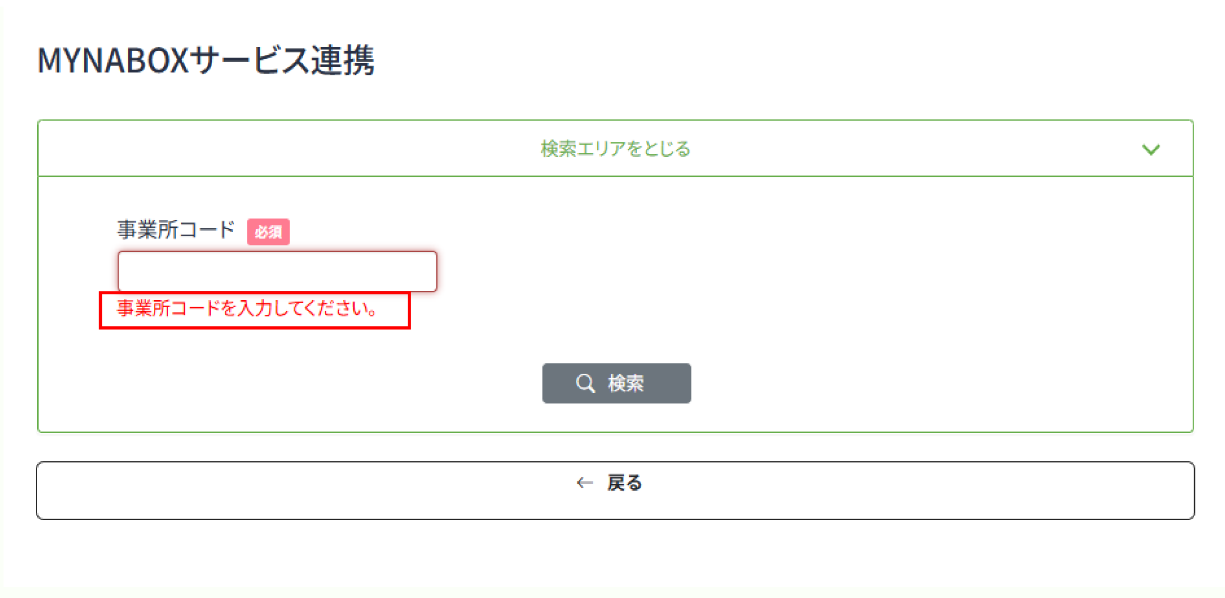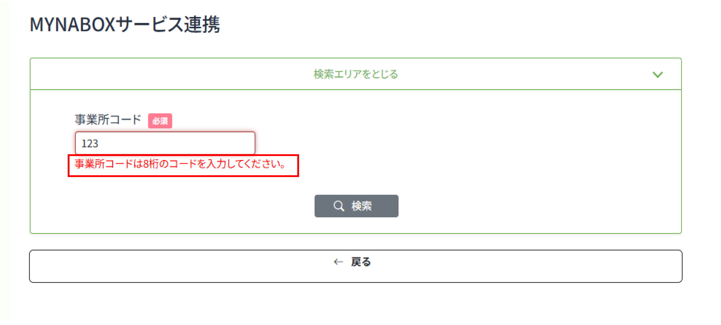 ○MYNABOXの事業所コード検索で、空欄で検索・7桁以下のコードで検索・9桁以上のコードで検索するとシステムエラーが発生しておりました。その為、MYNABOXの事業所コード検索に入力チェックを追加して改善します。
