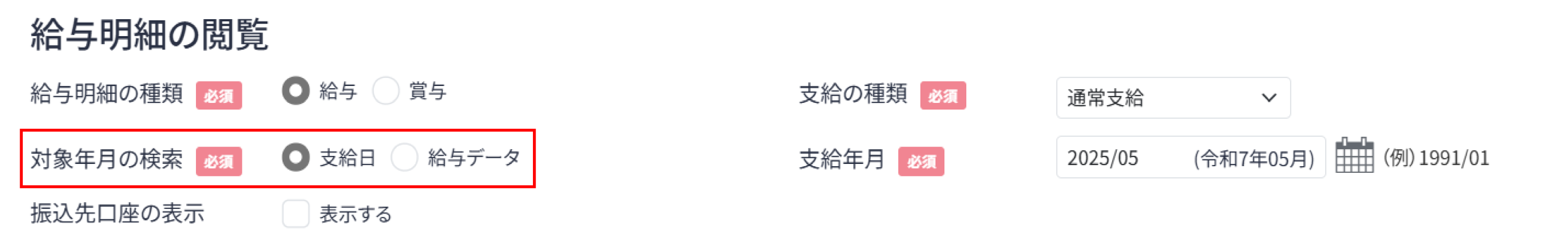 ※支給日が「yyyy/mm/dd」や「yyyy年mm月dd日」形式でない明細データを取り込んだ場合、「支給日」のラジオボタンを選択しても検索されません。その場合、「給与データ」のラジオボタンに切り替えた上で、支給年月を選択していただく形となります。