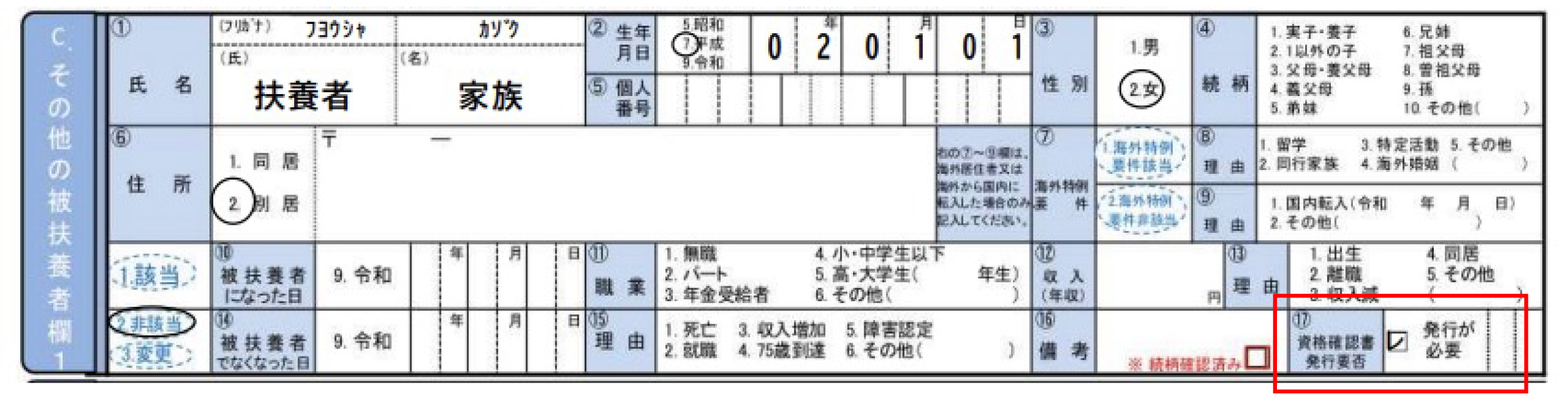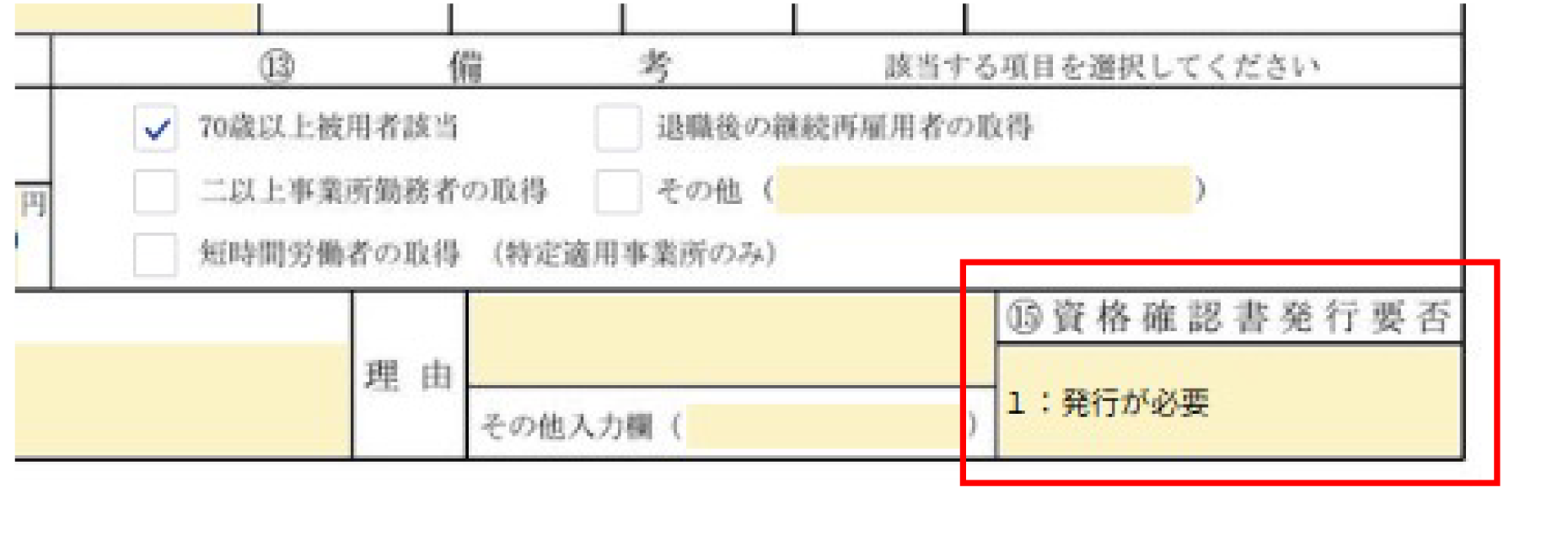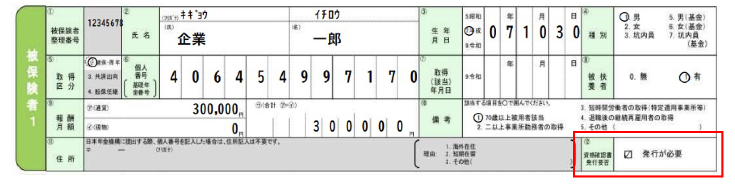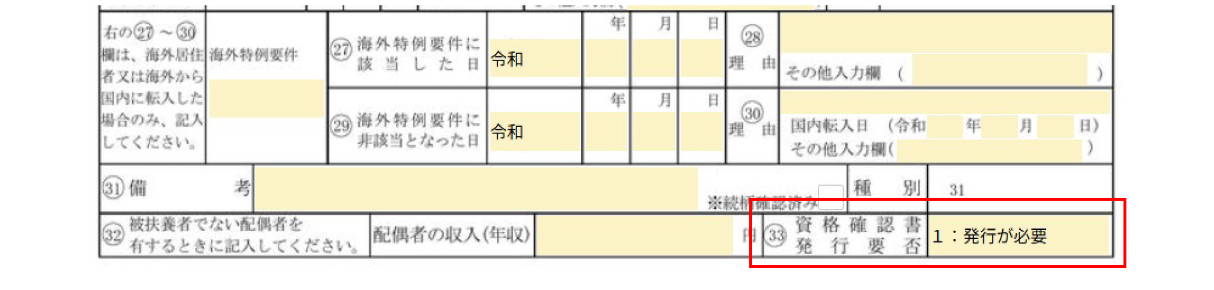 資格確認書発行要否が「必要」の場合は「1:発行が必要」と表示され、「不要」または未選択の場合は空欄となります。