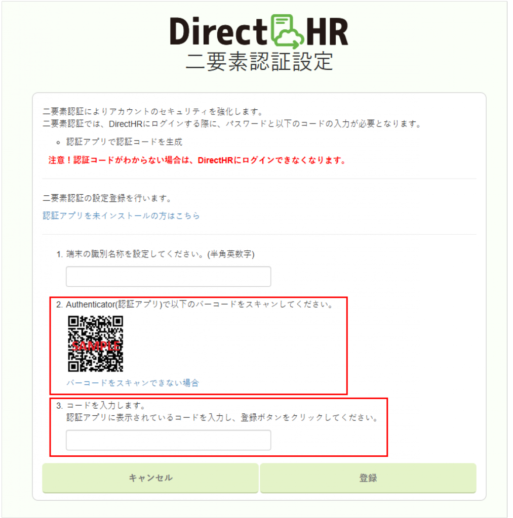 QRコードを読み込むことができない場合は、「バーコードをスキャンできない場合」で表示される情報を認証アプリに入力します。