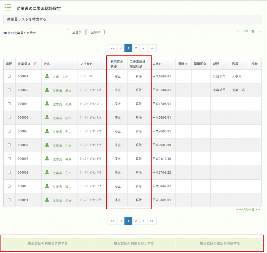 従業員や管理者、部門管理者の二要素認証の設定状況を確認します。利用停止や利用再開、設定の解除ができます。