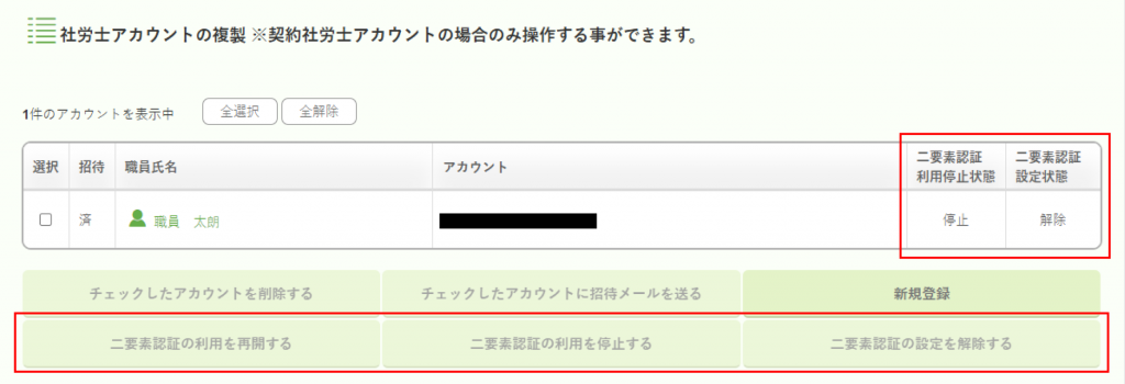 社労士アカウントを複製して招待する既存機能のほか、二要素認証の設定機能を追加しました。複製社労士の利用停止や利用再開、設定の解除ができます。