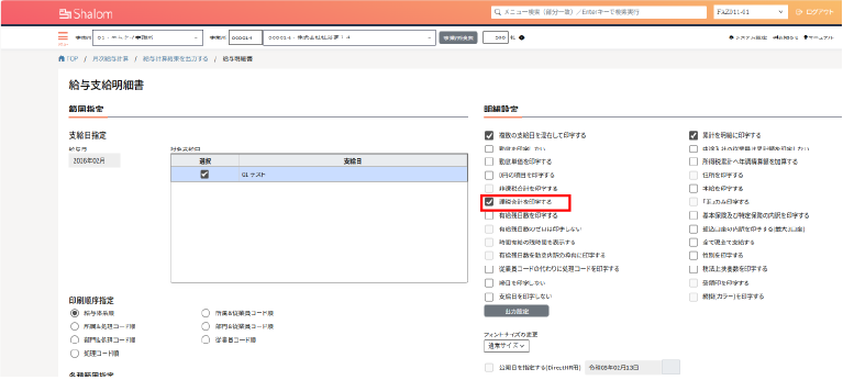 給与明細書に「□課税合計を印字する」の印字オプション機能を追加します。 ※賞与明細書も同様