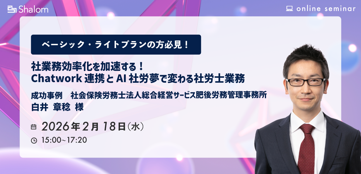 本セミナーでは、基調講演に社会保険労務士法人総合経営サービス肥後労務管理事務所 白井 章稔 様をお招きし、「社労士業務がビジネスチャット連携でどのように変わったのか?」実際の活用シーンや、今後の活用予定をうかがいます。またDX活用や、事務所運営についての成功事例を詳しくお話いただきます。