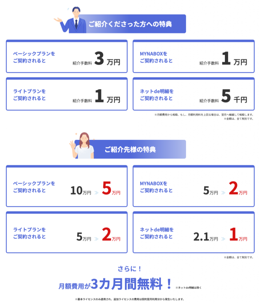 各製品の初期費用の御値引と、ご紹介くださったユーザー様にご紹介手数料