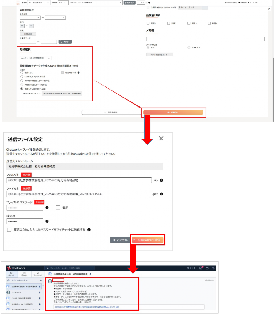 給与計算後のデータをPDF形式(A4カット紙窓開封筒用)への印刷を実行する際にChatworkへ連携して送信することが可能です。