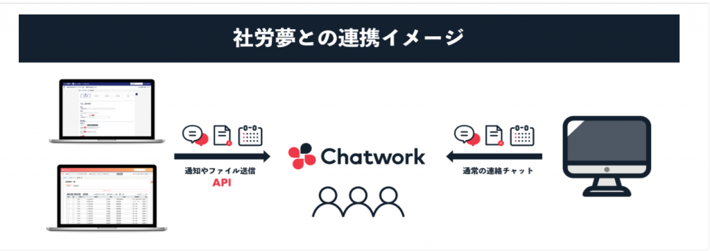 多くの社労士事務所や顧問先企業ではビジネスチャット「Chatwork」をはじめとするチャット機能が日常的に利用されていますが、その中でも「Chatwork」は直感的に利用できる国産ビジネスチャットツールとして多くの社労士事務所に活用されています。 こうした環境を踏まえ、当社が提供する「社労夢」と「Chatwork」をシームレスに連携させることで、通知やファイル配信を自動化し、これまで人手に頼っていた煩雑な業務を大幅に効率化できると考えています。